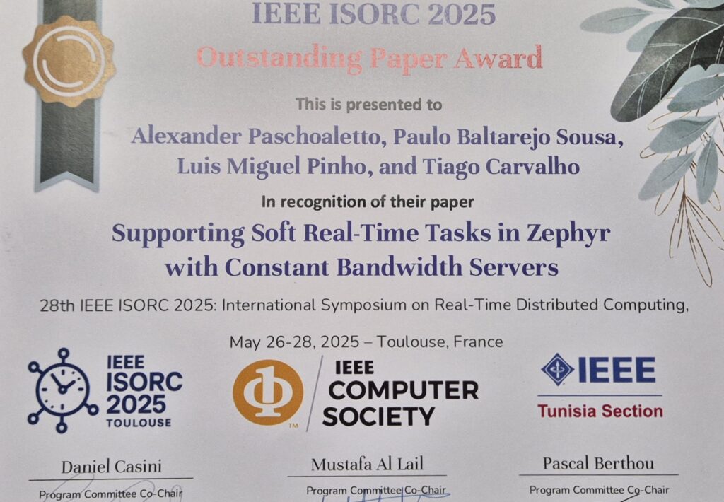 The paper “Supporting Soft Real-Time Tasks in Zephyr with Constant Bandwidth Servers”, authored by SoftCPS researchers Alexander Paschoaletto, Paulo Baltarejo Sousa, Luis Miguel Pinho and Tiago Carvalho, received an “Outstanding Paper Award”, at the 28th IEEE International Synpoisum on Real-Time Distributed Computing (ISORC 2025) Conference.